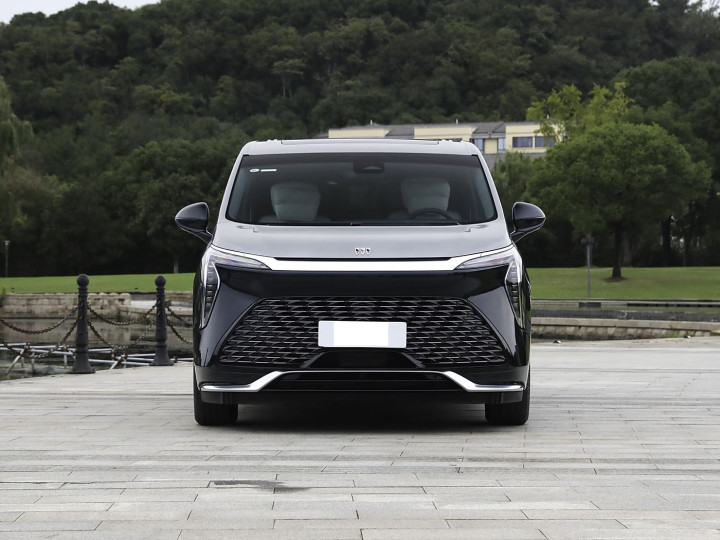 进入车内,宽厚且错层的中控台配备30英寸6K曲面双联屏,搭载骁龙8155芯片,支持手势控制与AI语音交互。保留实体空调按键,提升行车操作便利性。材质方面新车采用了蓝白拼接真皮座椅、翻毛皮车顶、铝制饰板与木纹饰条混搭,氛围灯支持128色调节,星空顶版可选装366颗动态流星灯效。其中四座布局车型后排配备32英寸可升降隔断屏,支持220V电源输出;座椅支持1.2米滑轨移动,18向电动调节带石墨烯加热与9种按摩模式。六/七座版车型的第二排航空座椅采用减振乳胶填充,第三排腿部空间达同级最优,支持电动放倒与儿童座椅接口。