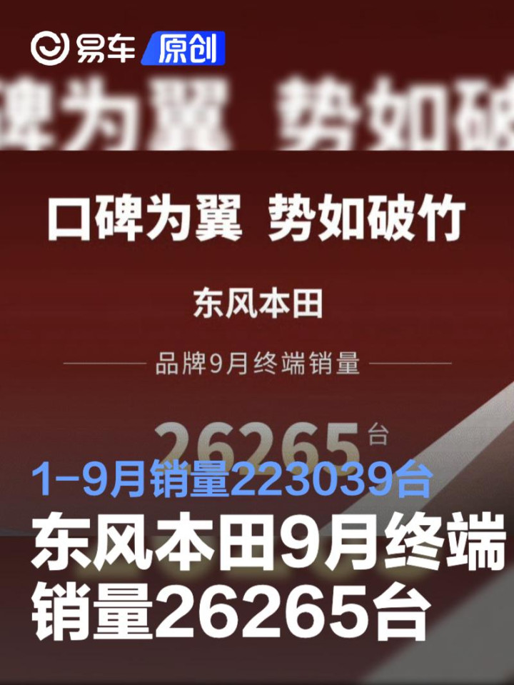 易车讯日前,东风本田公布最新销量数据。2025年9月,东风本田终端销量26265台,1-9月累计终端销量223039台。