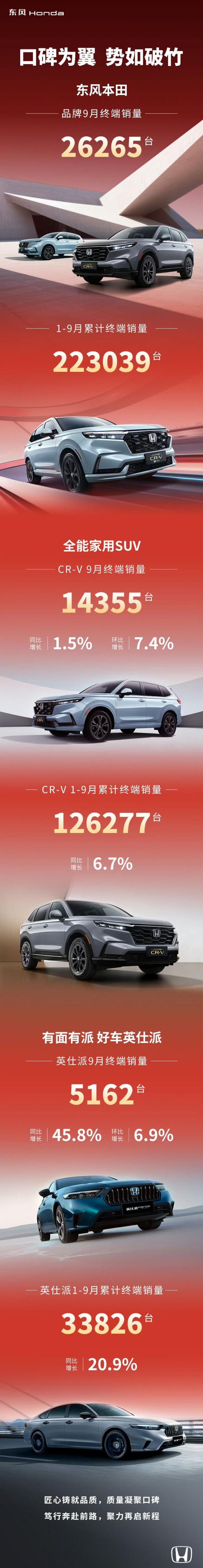 具体来看,东风本田CR-V9月终端销量14355台,同比增长1.5%,环比增长7.4%,1-9月累计终端销量126277台,同比增长6.7%;英仕派9月终端销量5162台,同比增长45.8%,环比增长6.9%,1-9月累计终端销量33826台,同比增长20.9%。